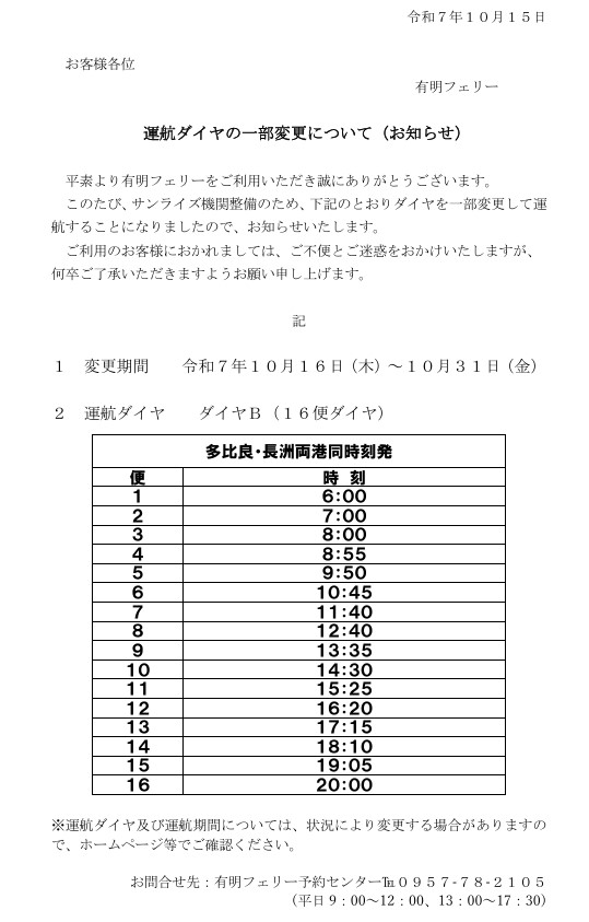 船舶機関整備のため、10/16(木)~10/31日(金)の期間は、運航ダイヤを変更(ダイヤA19便→ダイヤB16便)いたします。
