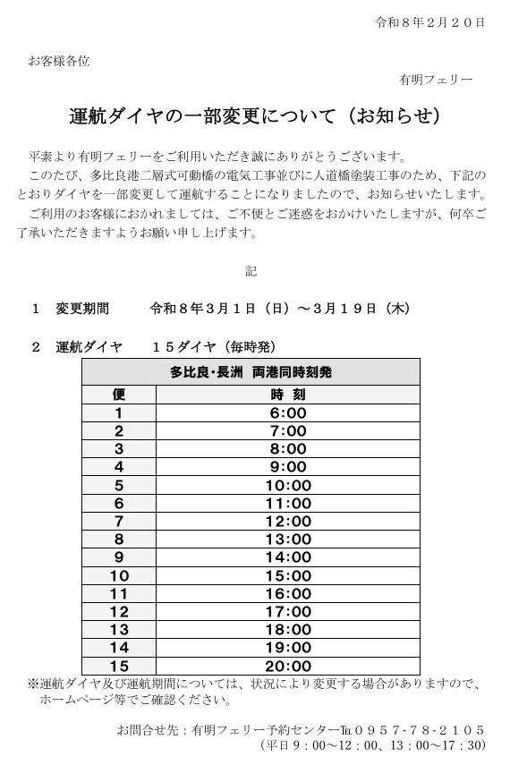 令和8年3月1日(日)~3月19日(木)の期間は、多比良港二層式可動橋の電気工事並びに人道橋塗装工事のため、運航ダイヤを一部変更いたします。